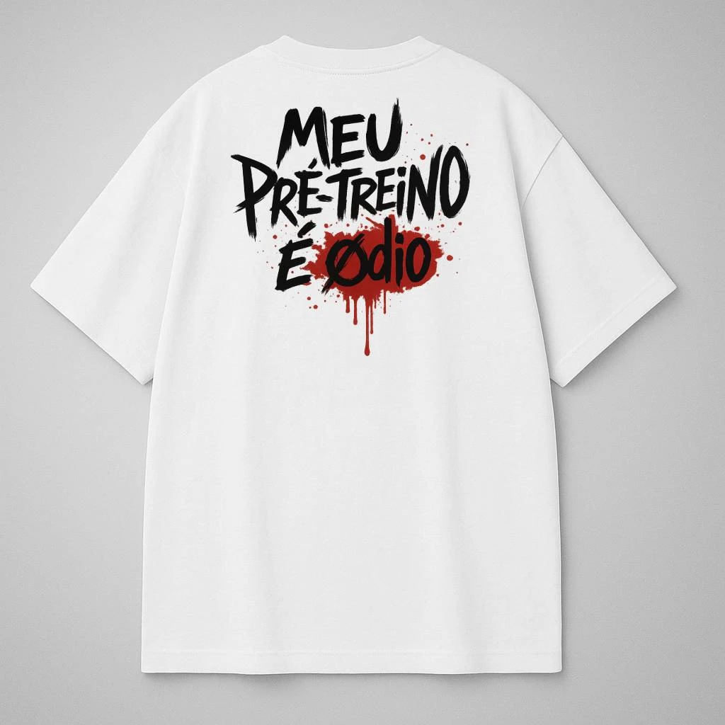 Nas costas, a frase “MEU PRÉ-TREINO É ÓDIO” em tipografia agressiva com efeito de tinta escorrendo em vermelho traduz exatamente o sentimento de quem entra na academia com o coração batendo forte e a mente focada em destruir seus próprios limites.