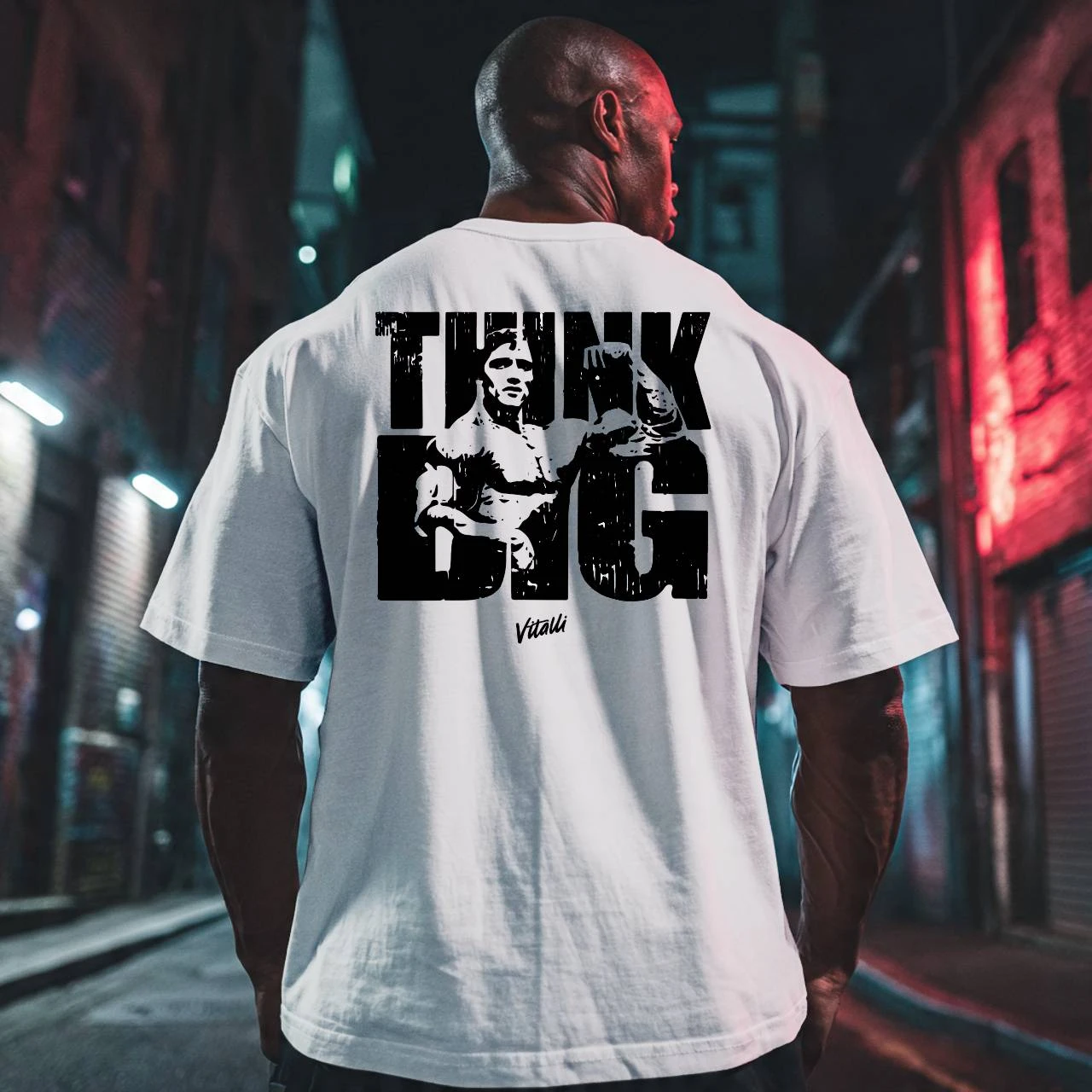 Nas costas, a estampa poderosa “THINK BIG” com arte icônica de força e determinação transmite uma mensagem clara: quem pensa pequeno vive pequeno. Essa peça representa mentalidade, atitude e propósito.